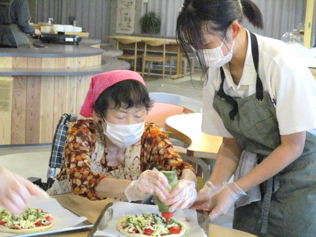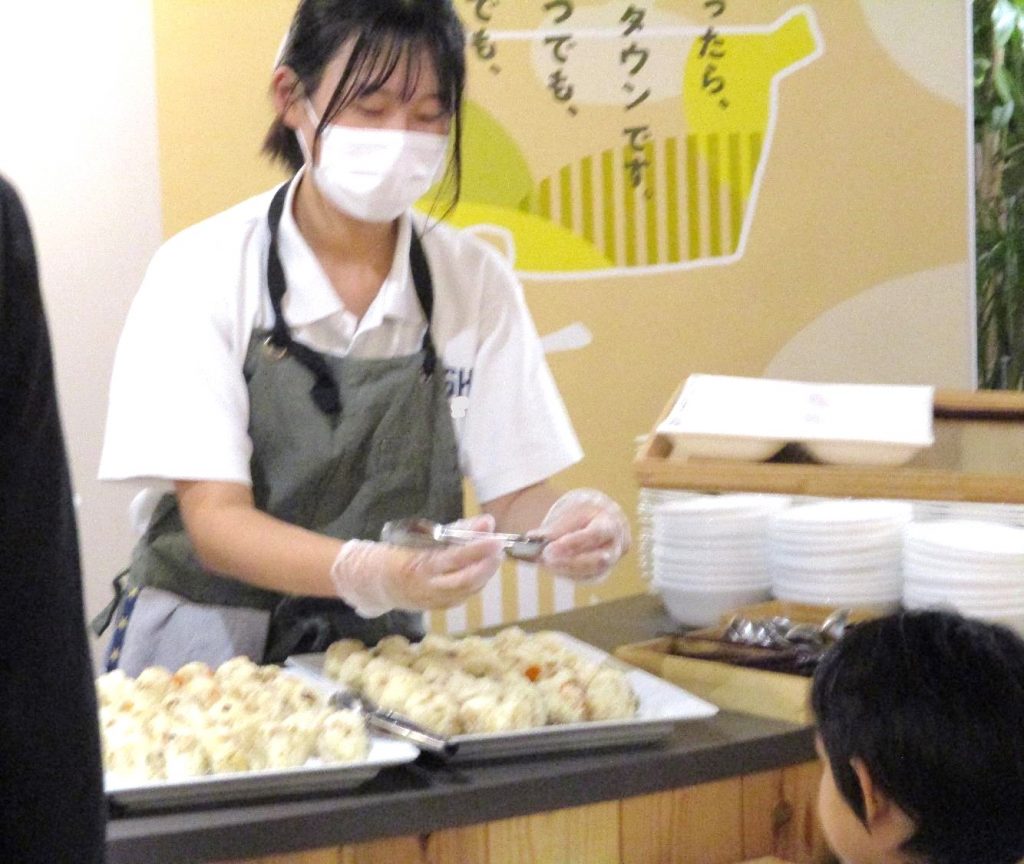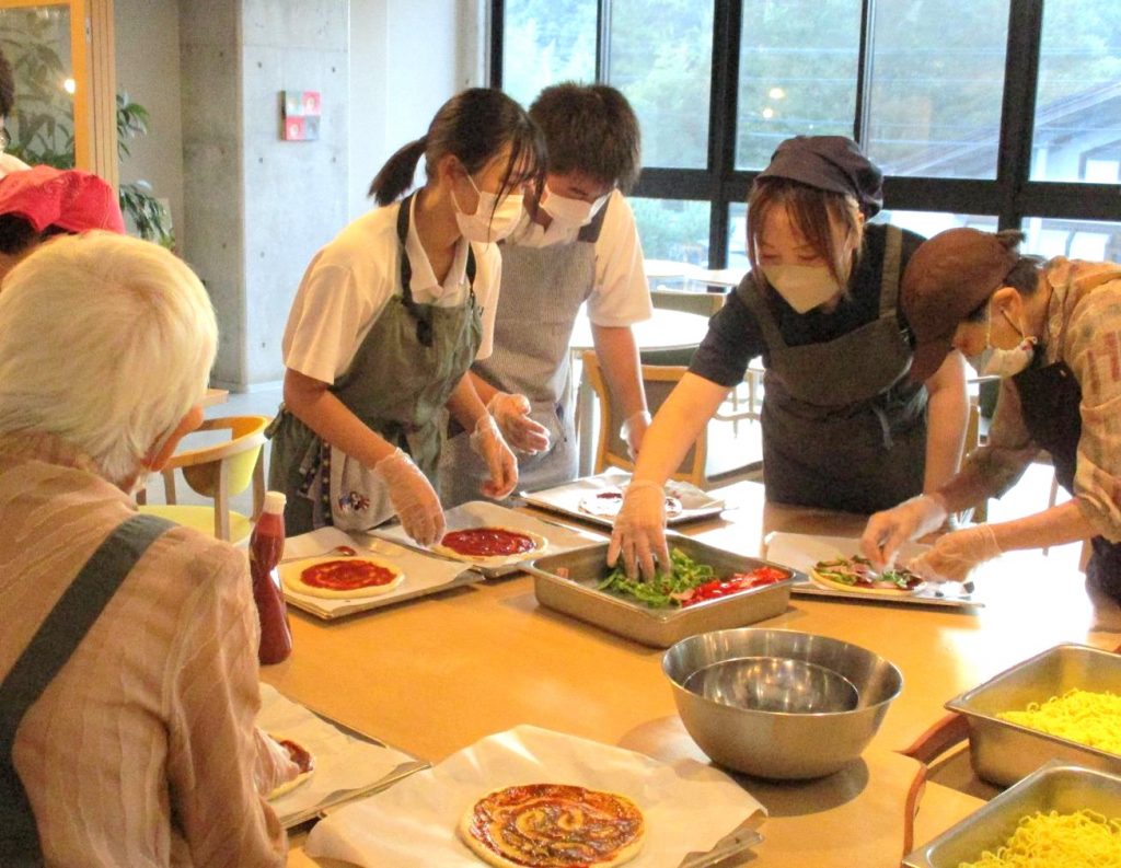 この日のメニューは、焼きそば、からあげ、ピザ、五目おにぎり、だし巻き卵、白身魚のフリッター、2種類のスープなどなどもりだくさん。生徒たちは、スタッフの方やスープタウン3階の有料老人ホームに入所している高齢者のみなさんとおしゃべりをしながら、焼きそばとピザ作りを担当しました。18時過ぎから、小さな子どもたちやそのご家族、スープタウン3階にある老人ホームの利用者やスタッフの皆さんなどが続々と集まり、にぎやかな夕食が始まりました。生徒たちは、子どもたちや高齢者の方がバイキング形式となっている料理を取るお手伝いをした後、一緒に食事をいただきました。あちこちのテーブルでは、さまざまな世代どうしでの会話がはずんでいました。