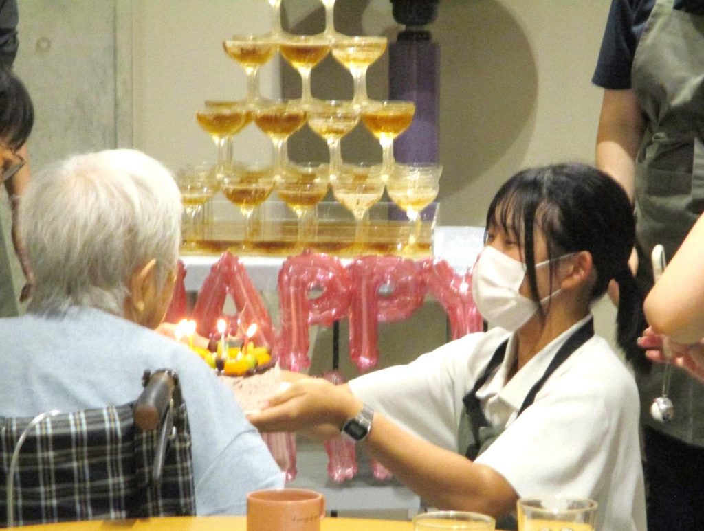 この9月26日は、3回の老人ホームで生活している方のお誕生日。それも100歳のお誕生日ということで、お祝いの手作りケーキとシャンパンタワー(中身はジンジャーエール)がサプライズで用意され、参加者全員でお祝いをしました。