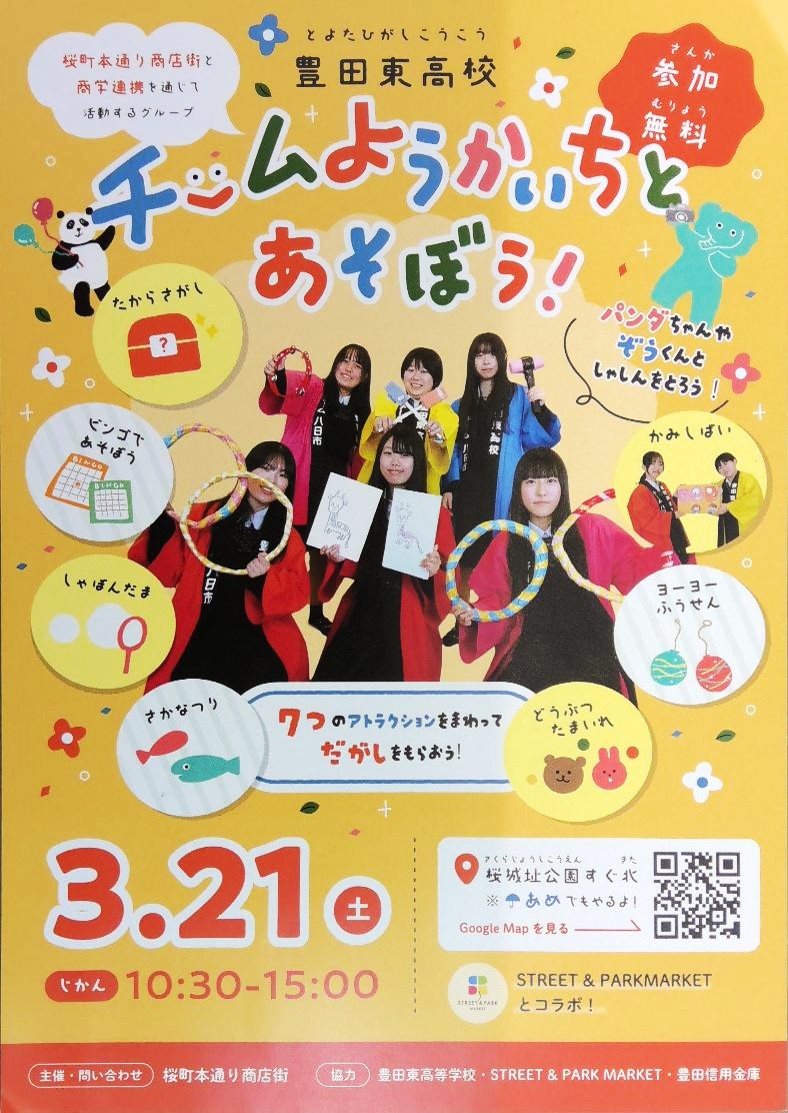 桜町本通り商店街との連携活動「豊田東高校 チーム八日市とあそぼう!」を、今年も令和8年3月21日(土)10:30~15:00に開催します!