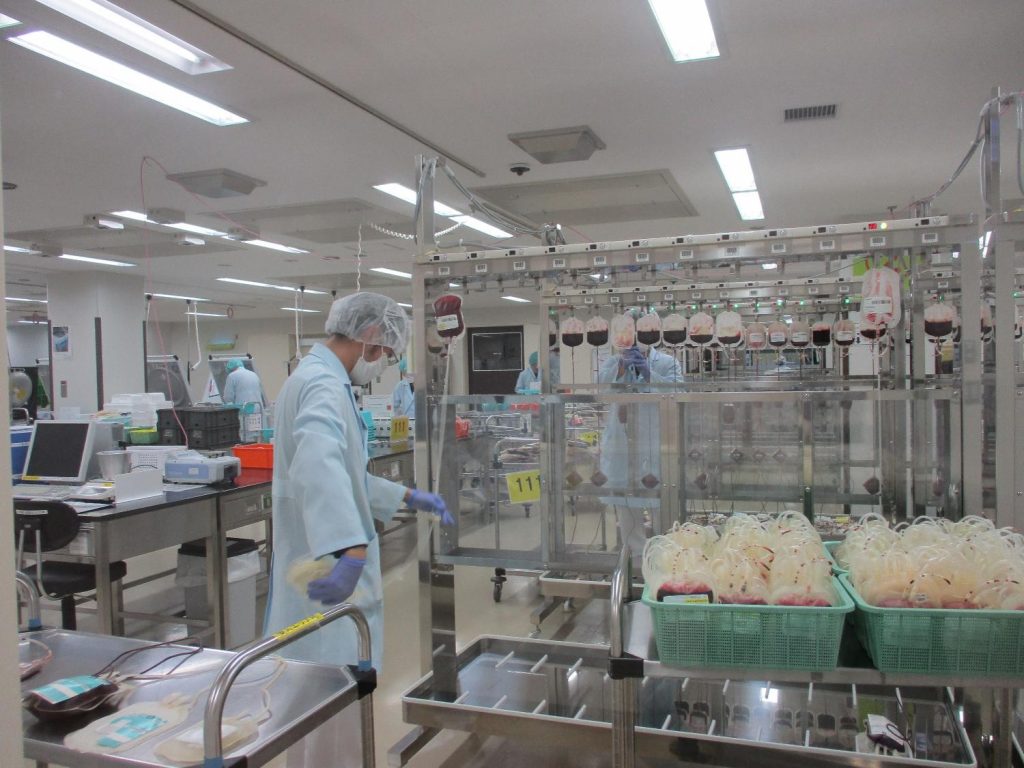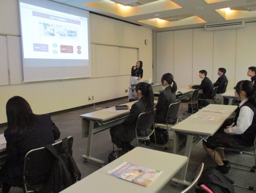 まず、血液センターの職員の方から、献血の意義やその歴史、血液センターの業務について説明をしていただき、その後は少人数に分かれて施設見学をしました。日本赤十字社の血液事業に関する写真や説明のパネル展示のほか、県内の献血会場から運ばれてきた血液の検査や分離・血液製剤の製造・保管・供給作業の様子を見学することができました。日頃、献血に協力をしたり、呼びかけボランティアを行っている生徒たちですが、提供された血液がその後どのように役立てられているのか、改めて学ぶことができました。