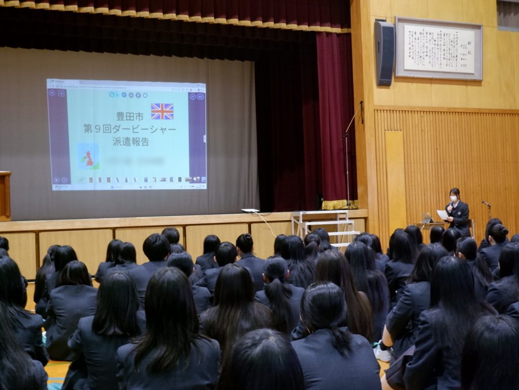 また、この日は豊田市の高校生派遣団として姉妹都市のイギリス・ダービーシャーを訪ねた生徒がその報告を行いました。たくさんの写真とともに、ホストファミリーとの交流などの様子を話していました。