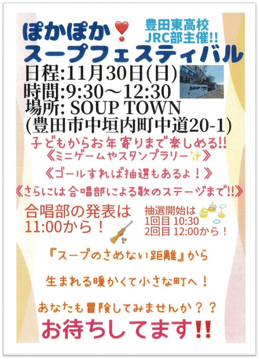 令和7年11月30日(日)、複合福祉施設スープタウンにて、「ぽかぽか♥スープフェスティバル」を開催します。昨年度まで美里のスマイリングキッチンラボで行っていた「東高まつり」をバージョンアップしました!