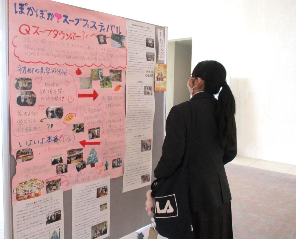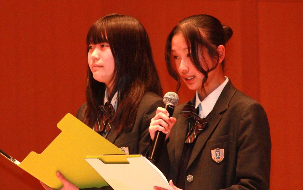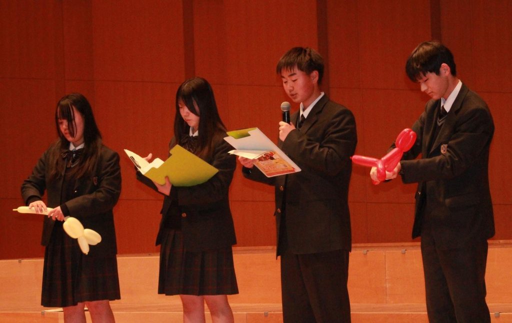 午前はオープニングに続き、ESD活動として国際理解教育、地域連携教育に取り組んだ生徒の報告や、各学年が取り組んだ「産業社会と人間」「総合的な探究の時間」での取り組みの成果発表がありました。