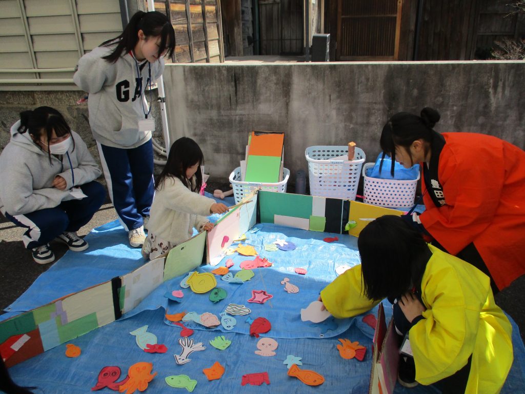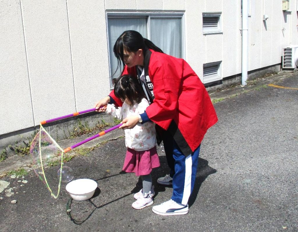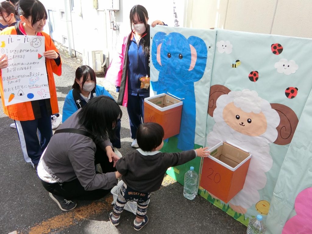 「八日市と遊ぼう」は2回目だったので、1年生と2年生の連携がうまく取れるように、積極的に1年生に声を掛けるようにしました。また、来てくれた親子の方に笑顔で対応すること、子どもの年齢に合わせた声掛けをして、楽しい雰囲気を感じてもらえるようにしました。自分たちの企画で遊んでもらうことは初めてだったので、ルールが多いと3歳ぐらいの子には難しそうということや、親しみやすいもの、何かもらえるなどのワクワク感があるものが楽しんでもらうカギになるなと気づきました。その中で、少しルールを変えればどの年齢の子も楽しめることに気づき、みんなで考えて作る大切さを学ぶことができました。また、2年生になり初めて紙芝居をすることになり、実際にやってみて、子どもたちは私たちが読むスピードを思っている以上に速いと思っていることに気づき、ゆっくり読むこと、でも紙をめくるスピードはゆっくりでなくても大丈夫なことを知りました。これからの活動に生かしていきたいです。(保育プラン2年)