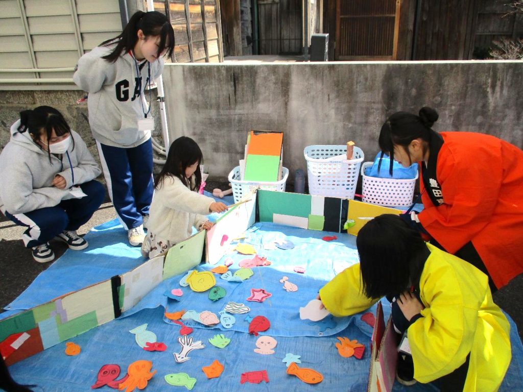 私の担当は魚釣りでした。今回心掛けたことは、子どももお父さん・お母さんみんなに楽しんでもらえることです。積極的に話しかけ、どんな魚が釣れたか、どんな魚が好きかなどたくさんお話することを心掛けました。お父さんやお母さんも一緒に魚の数を数えてもらったりしました。実際に「釣れたのが何の魚かわかる?」と聞いてみると答えてくれて、なにも声をかけずにやってもらうより楽しんでくれたのかなと思いました。釣った魚をお父さんやお母さんに自慢して見せていた姿がとても可愛かったです。お昼前の時間帯はとても人が多くて、自分たちだけで対処しきれないぐらいの時があったので、時間制限をしたりするなどの対応を考えていきたいです。(JRC部)
