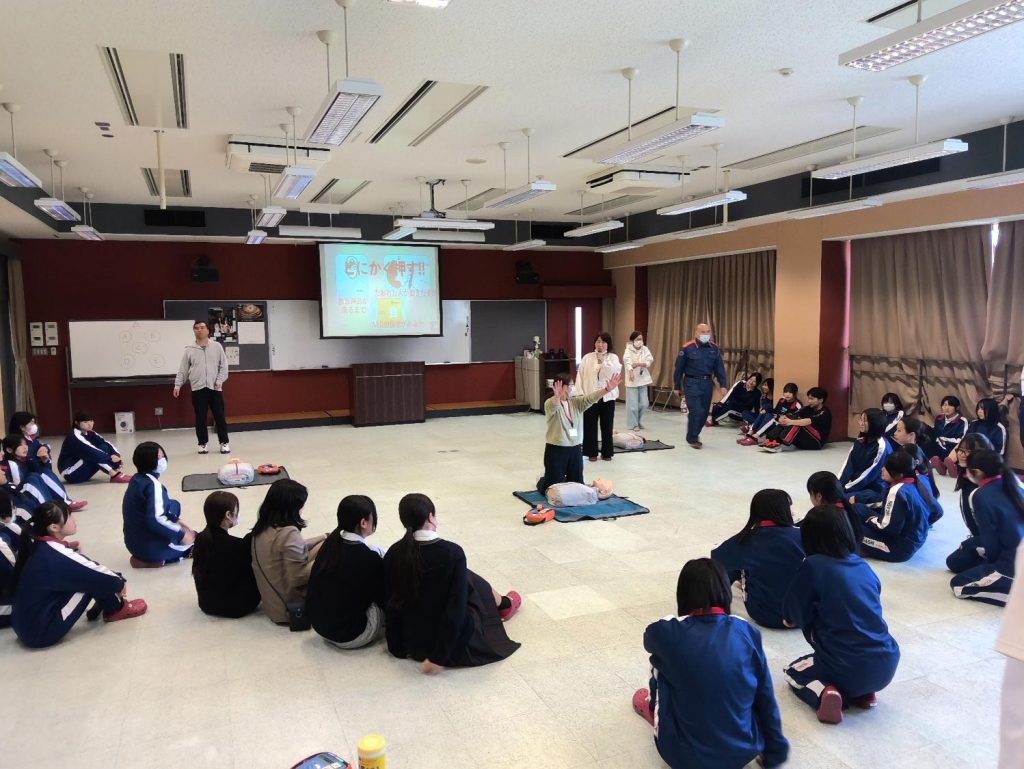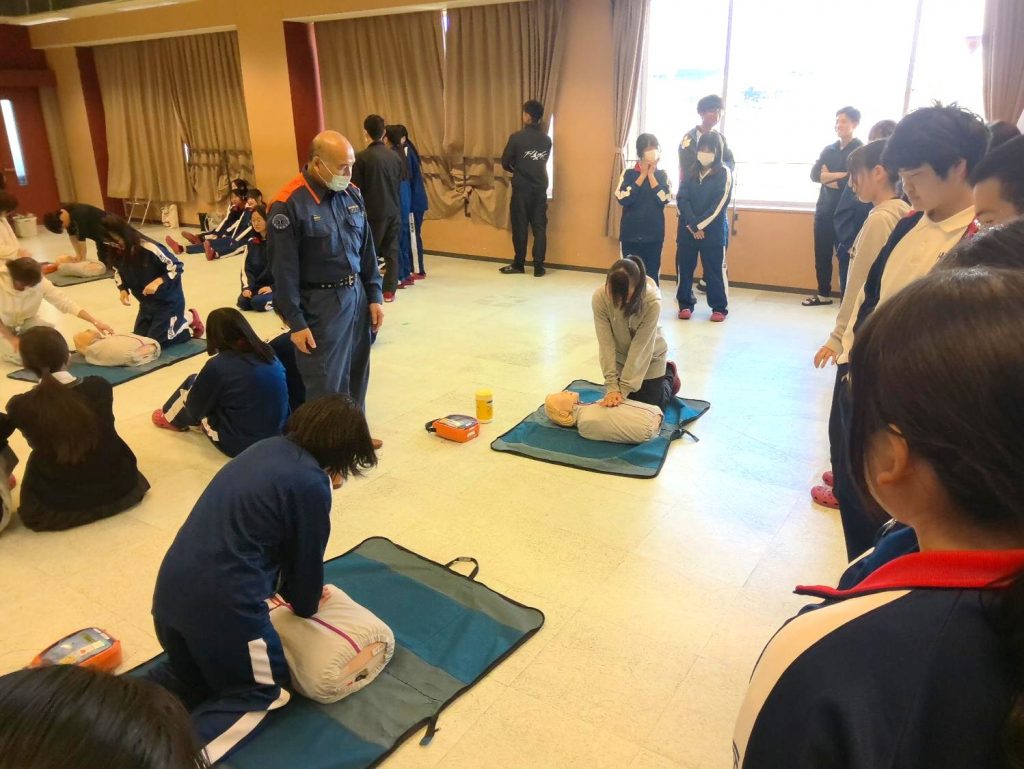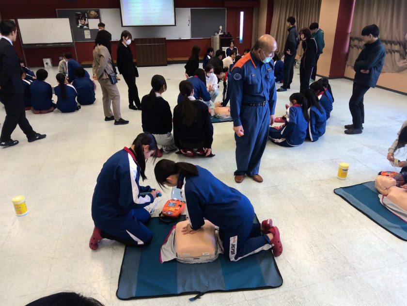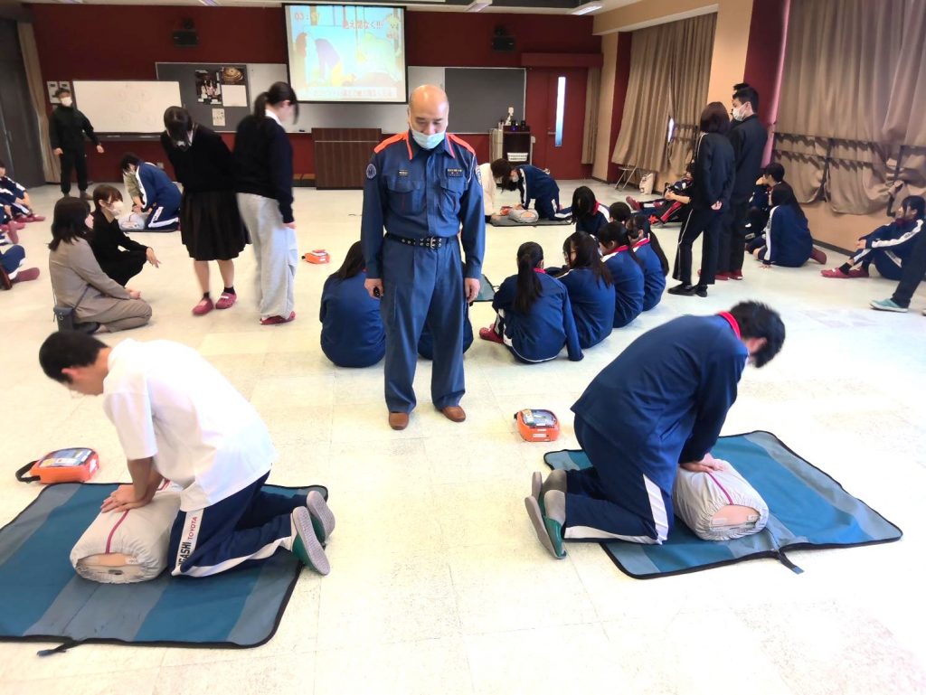 令和8年4月2日(木)、豊田市消防署(中消防署)より講師をお招きして、救命救急講習会を実施しました。学校管理下でも発生しうる災害に備えて、AEDの使用方法や心肺蘇生法を学びました。平常授業時間内に限らず、休日の部活動時のことも想定し、教員のみならず、運動部・文化部のリーダーやマネージャーも参加して、身近にいる生徒間でも迅速かつ的確に対応できるように講習を受けました。